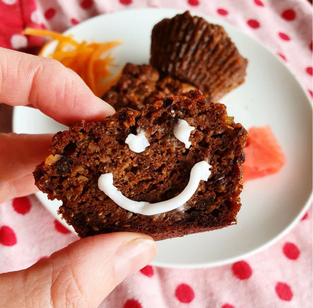 CARROT CAKE that’s healthy, tasty, easy to make and shaped like a hand-sized muffin! This recipe is one of our favourites and you’re guaranteed to find it in our fridge …